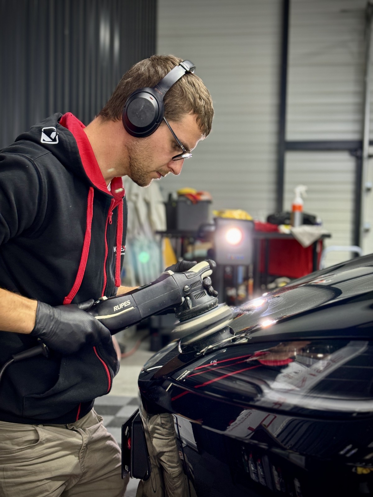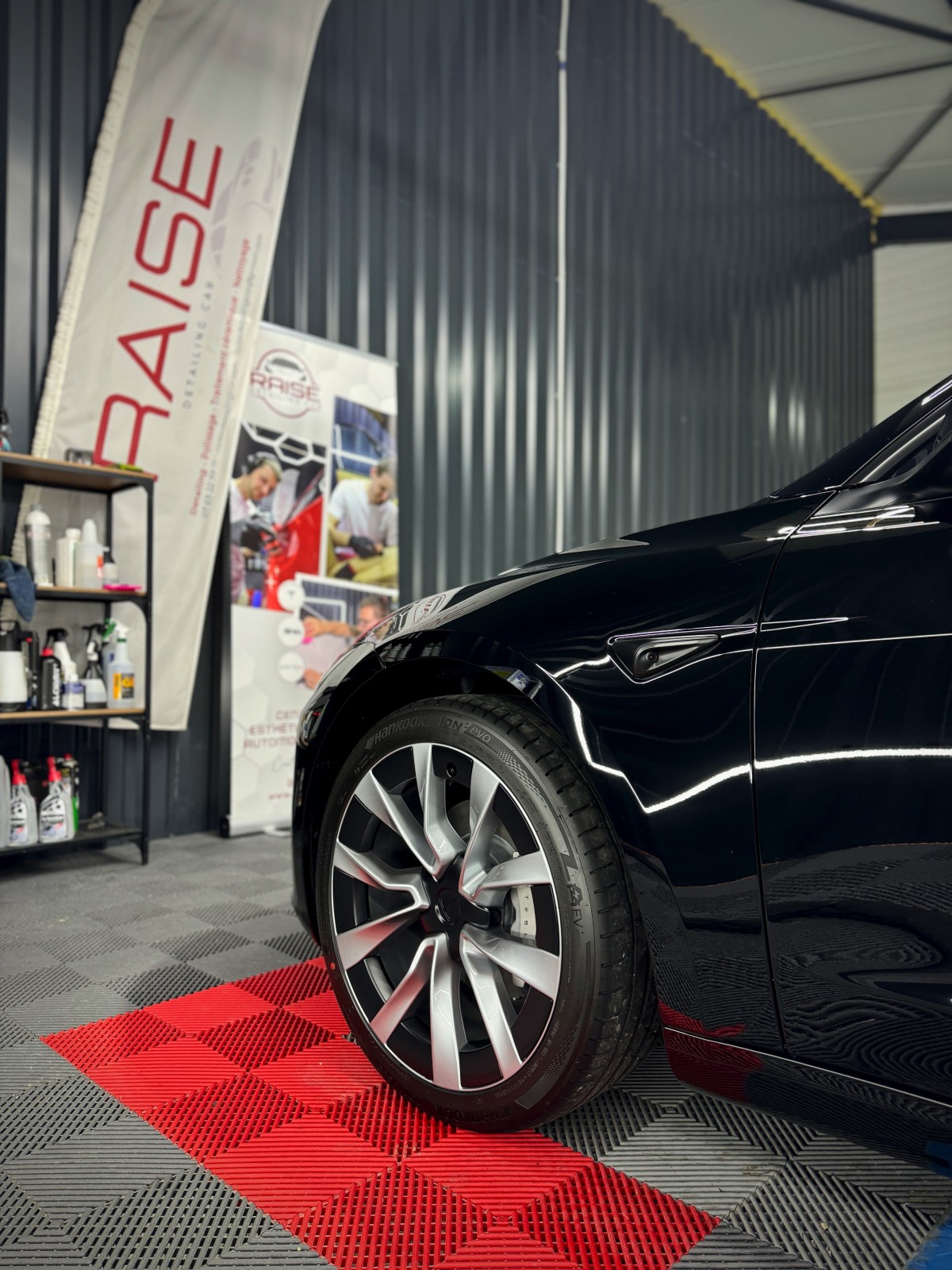 Récemment, un client venant d’Annecy nous a confié sa nouvelle Tesla Model 3 Highland, à peine sortie de concession. Malgré son jeune âge, la peinture noire unie présentait déjà de légères micro-rayures, visibles sous nos éclairages de contrôle. Avant la pose du traitement, nous avons donc réalisé un lustrage minutieux afin de redonner à la carrosserie toute sa perfection.